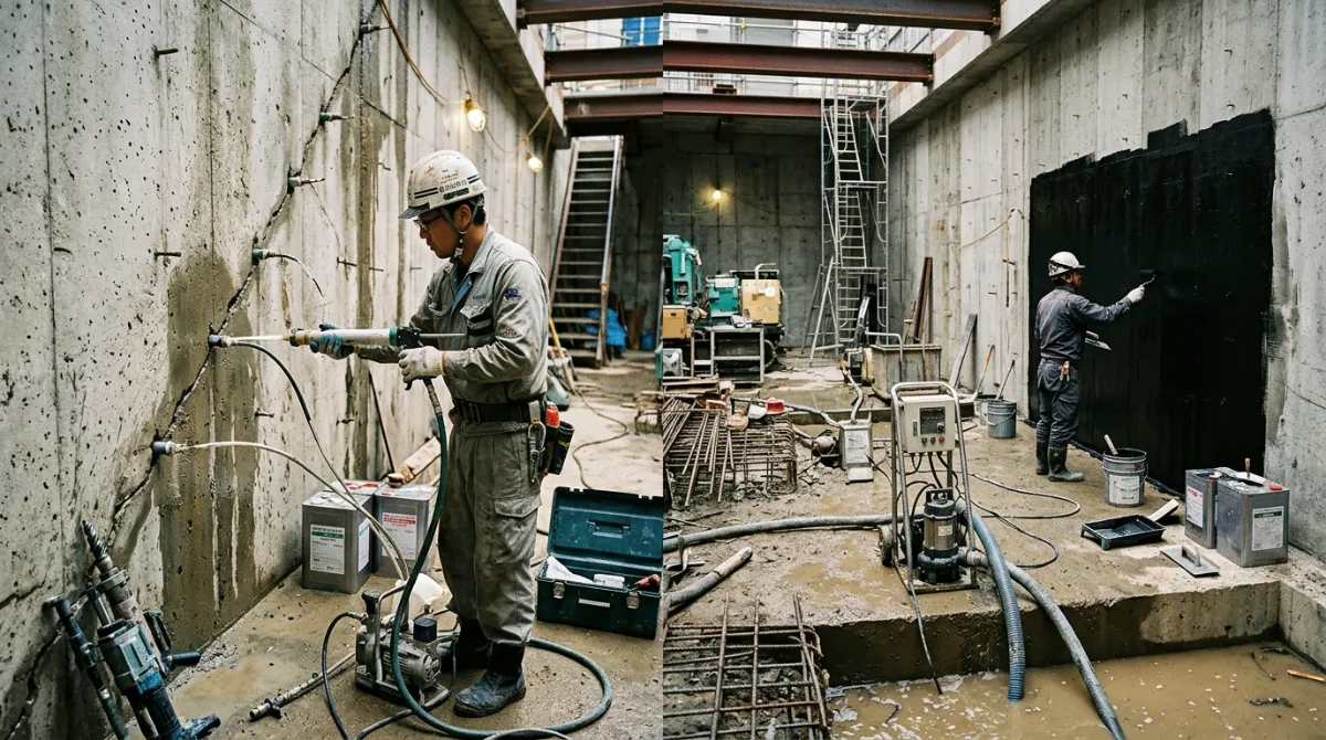 ひび割れや打継ぎ部に孔をあけ、樹脂やセメント系材料を圧入して水の通り道をふさぐ方法です。局所的な漏水に対して有効で、既存建物の改修で多く使われます。