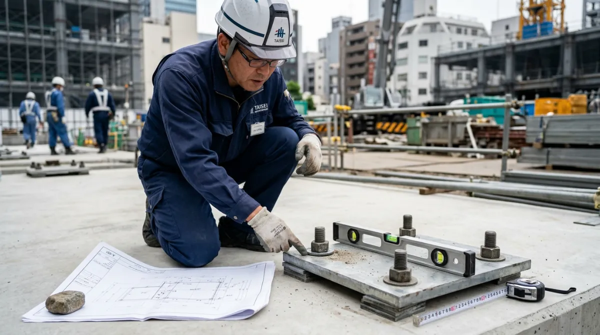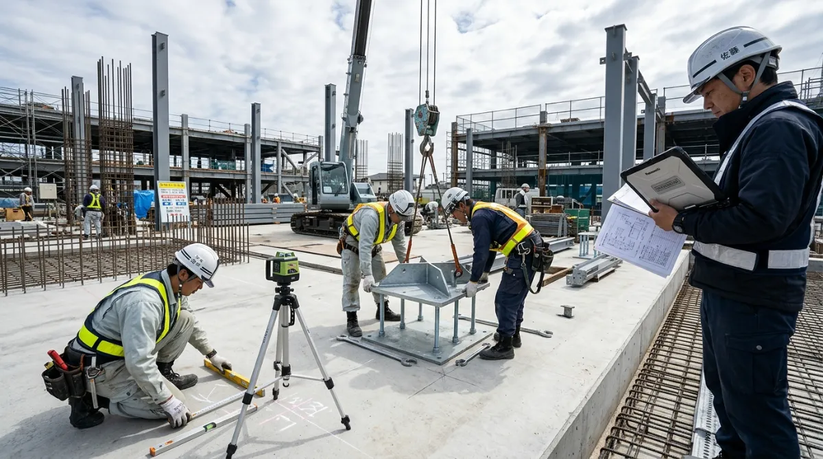 プレート据付工事では、アンカーボルト位置精度とレベル出しが重要です。ボルト位置がずれるとプレート穴に通らない、耐力不足などの問題が生じます。