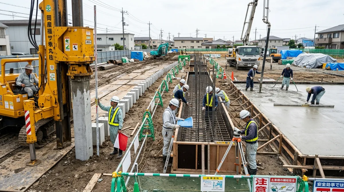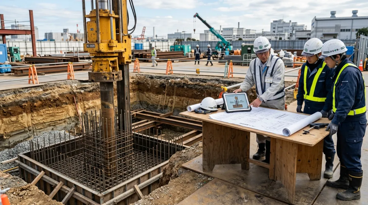 プレス基礎工事は、状況によっては杭工事や山留め工事、既存建物の解体工事などと密接に関わります。例えば、地盤条件が悪く深い支持層が必要な場合は、基礎下に杭を施工して荷重を伝える必要があります。